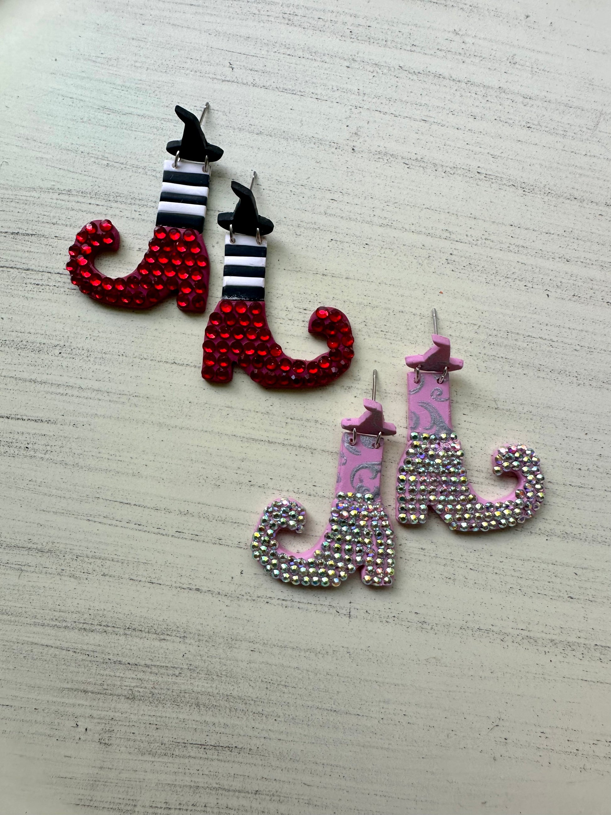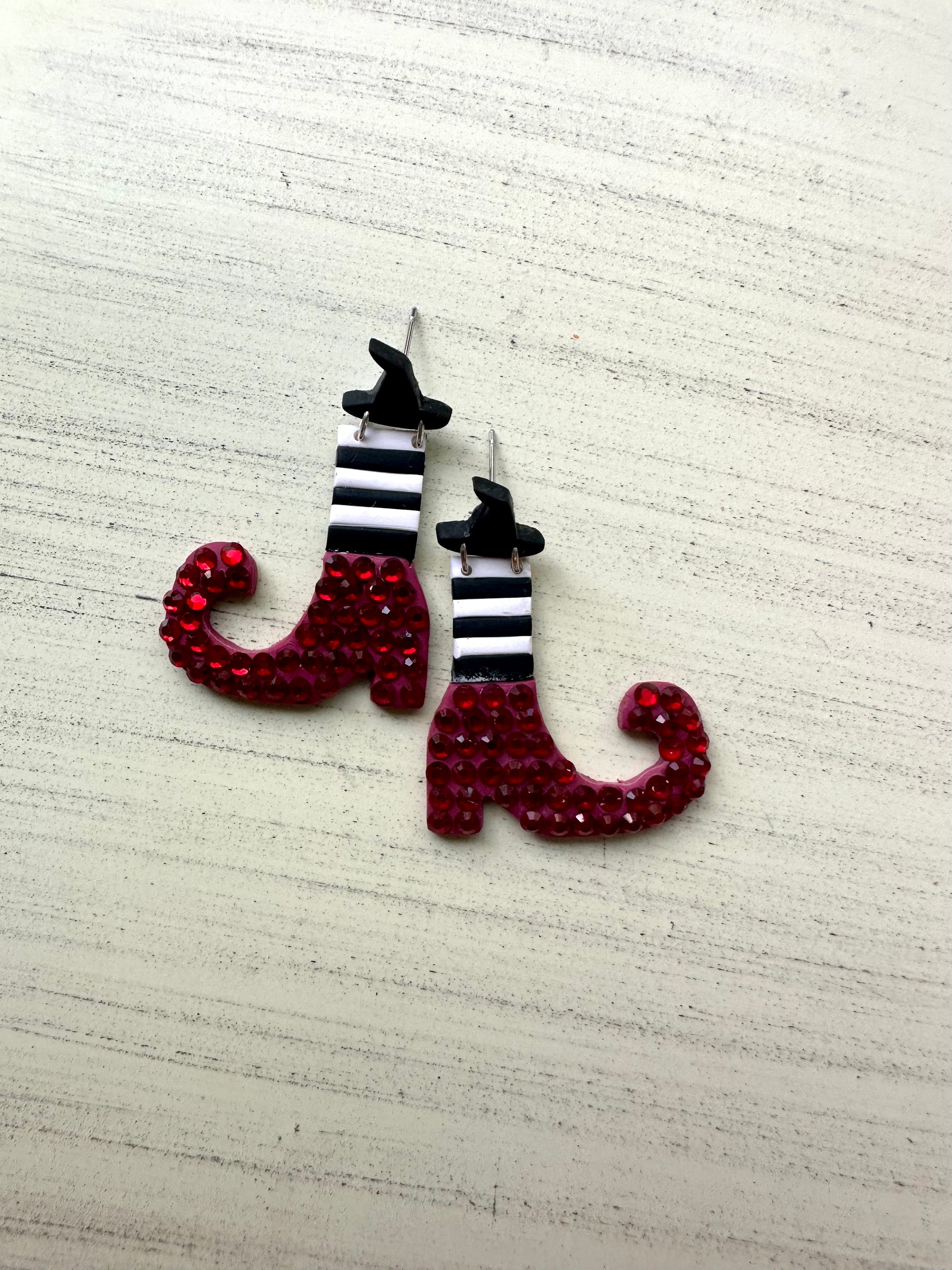 Step into the world of wicked magic with our striking earrings inspired by the iconic Wicked Witch of the West. Each earring is a miniature work of art, featuring black and white striped socks that add a touch of whimsy. The centerpiece of these earrings is a crimson red boot adorned with shimmering ruby studs, capturing the essence of the infamous ruby slippers. A bewitching witches hat sits atop each earring, casting a spell of allure and mystique.