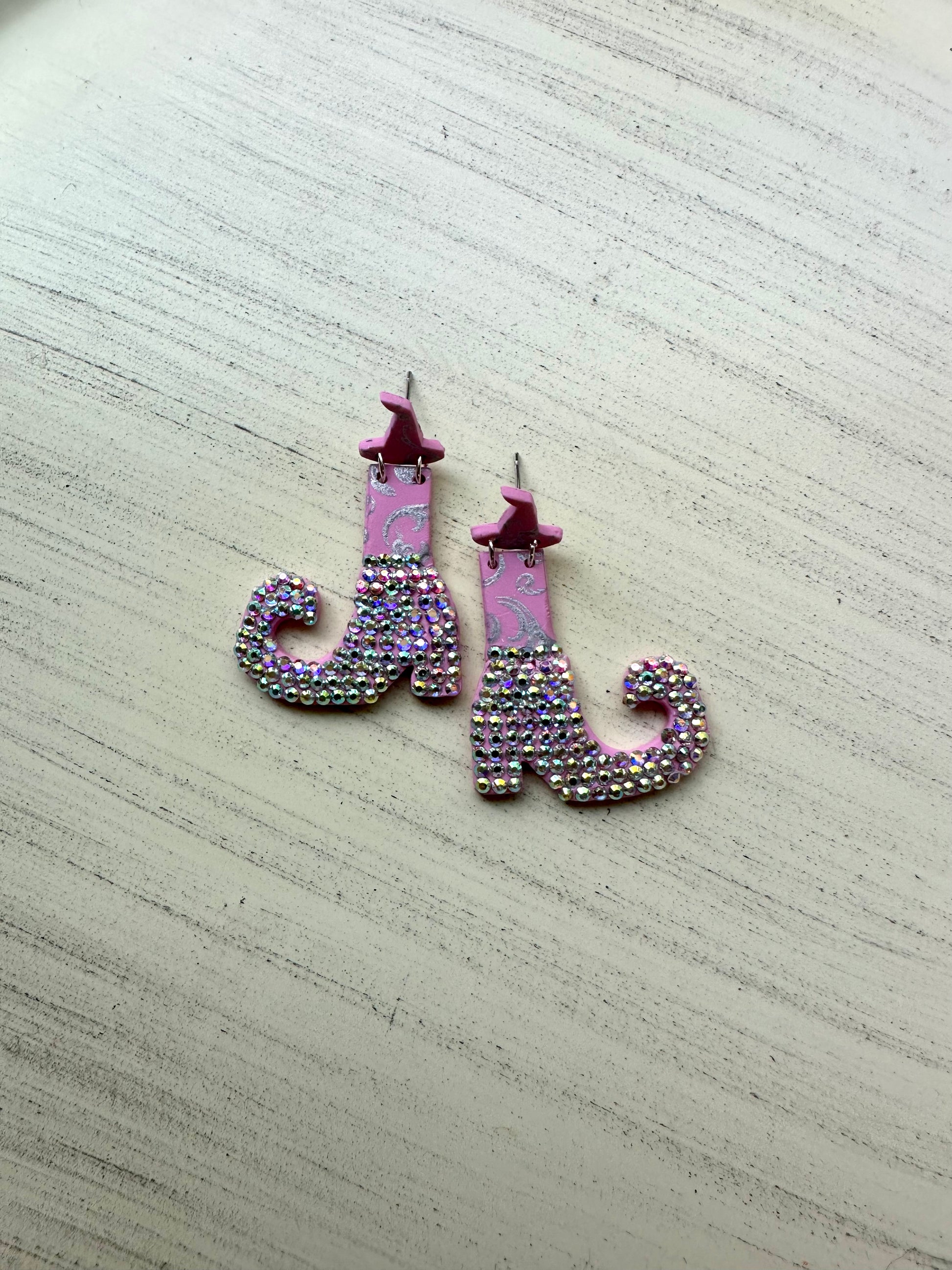 Radiate goodness and grace with our Glinda the Good Witch of the North inspired earrings. These delicate creations are a symphony of pink and silver swirls, symbolizing purity and magic. The boots, a harmonious shade of pink, twinkle with iridescent rhinestones that glisten like starlight. Adorning each earring is an ethereal witches hat, a beacon of hope and benevolence.